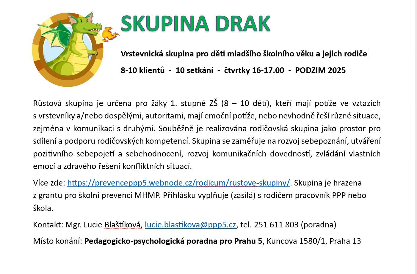 Indikovaná prevence - růstové skupiny: Pro 1. stupeň ZŠ skupina DRAK, 2. stupeň ZŠ skupina Labutě (více info v záložce Rodičům). Přihlášku zasílá nám oblastním metodikům po vyplnění s rodičem škola, e-mail v kontaktech - ke stažení zde: Přihláška DRAK Přihláška Labutě